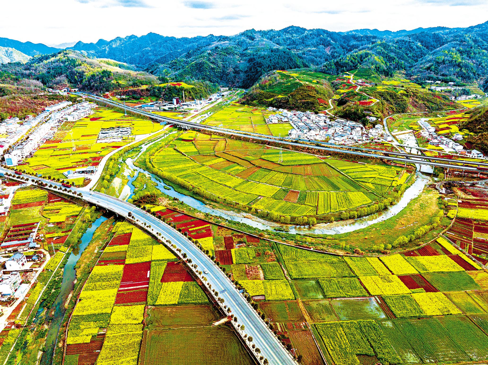 春暖花开时节,竹山县麻家渡镇一带,346国道、麻安高速、通村公路构成的交通网与田园风光相映生辉。