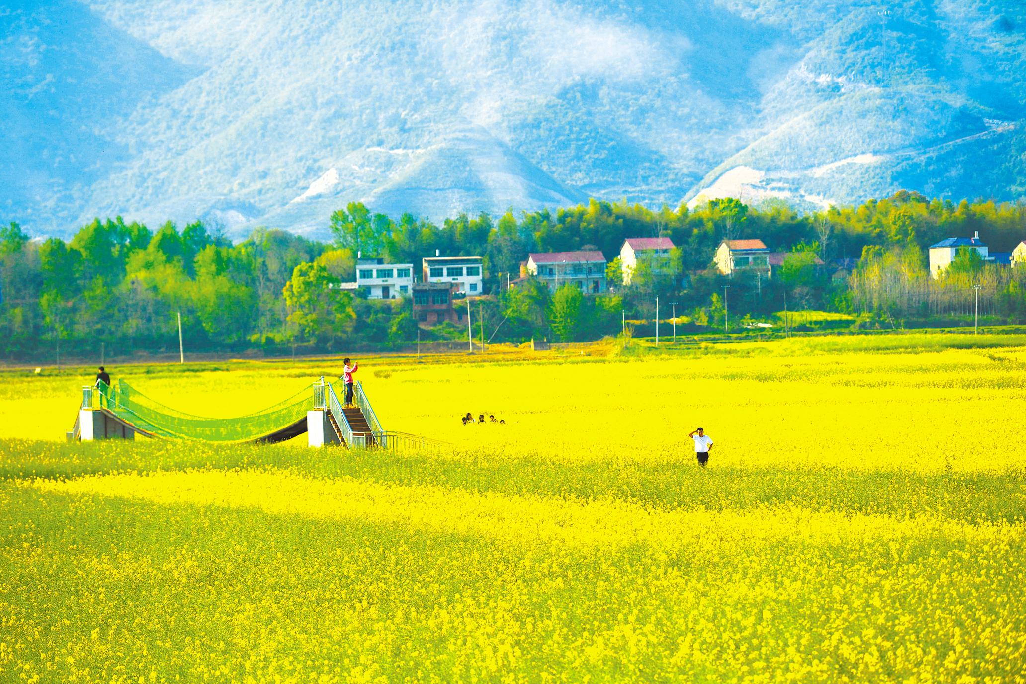 3月28日,游客在阳新排市长塘畈万亩油菜花海游玩。长塘畈连片种植万亩油菜,被省农业农村厅评为“2022十大湖北特色油菜花海”之一。油菜花节期间,游客量达50万人,带动4000人就业。