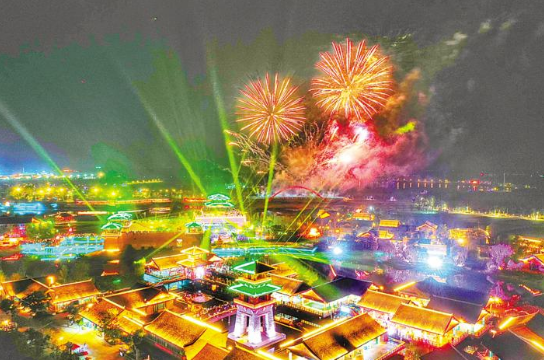 6月22日晚,仙桃市沔阳小镇景区“沔阳不夜城”盛大开街,1.5万名游客沉浸式夜游,点亮仙桃夜经济。“沔阳不夜城”集沉浸光影、美食小吃、潮玩商业等为一体,推出璀璨烟花秀、非遗打铁花、水乡花船情景剧等十大主题游玩项目,形成日游水乡小镇、夜游“不夜城”的“全时游”旅游新态势,吸引大批游客前来打卡。(视界网 刘贤双 摄)