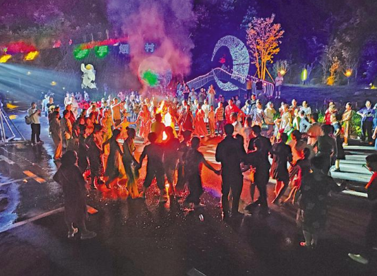 近日,京山市新市街道白谷洞村,“白谷烟树·山水画廊”乡村景区首届“牵手烟树·爱在烟树”炫彩夜泼水季开园。彩虹滑道、黄金麦田、萤火虫秘境、美食街、民俗舞蹈、泼水祈福、篝火狂欢等游玩项目,每天吸引近千名游客。 (湖北日报全媒记者 李剑军 通讯员 全薇 徐欢 摄)