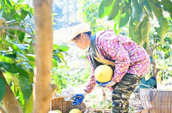 12月8日,来凤县百福司镇可洞村罗家坟果园基地,村民张金云正在采摘柚子。当前,可洞村120余亩琯溪红心蜜柚和凤凰白柚迎来丰收,个儿大、皮薄肉厚、水分多的柚子深受消费者喜爱。(通讯员 邓浩 汤煜东 摄)