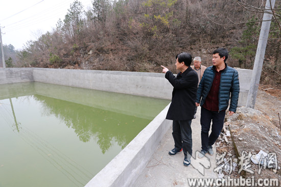 襄阳市国税局局长谢本洪现场查看已开始蓄水1800立方蓄水池。见习记者 刘涛 摄