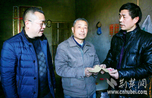 荆楚网讯(通讯员宋俊初 曹庆波 张辉明)1月20日下午,全国道德模范蒋志刚自掏腰包出资2000元,带领孝昌好人志愿者看望了4户低保及困难家庭,为他们每户送去了500元的慰问金。