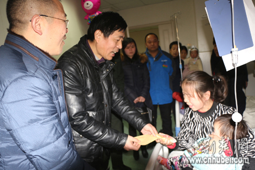 74岁的刘金楼是花园镇襄花村一组人,无儿无女,且丧失劳动能力,靠低保艰难度日。蒋志刚和孝昌好人志愿者一起,来到刘金楼老汉家中,将500元的爱心款交到了他的手中。随后蒋志刚和孝昌好人志愿者,来到该县第一人民10楼,小河镇黄湖村二组特困村民刘慧斌家小孩的病床前,将500元的爱心款交到了她的手中。