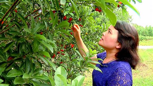 图为中南民大教授向梅先在基地内指导采摘杨梅果。
