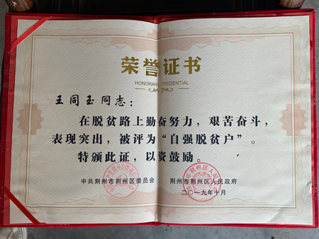 “扶上马,搭把手,送一程”,扶贫先扶志、智,脱贫关键还得靠自己。几年前,老王家经济困难,收入来源主要是夫妻俩务农和女儿做月嫂。自帮扶以来,朱堃与老王结成对子,他经常来老王家走访,逢春节、中秋节等还带慰问品以表心意,问他们身体怎么样、生活有无困难、农作物长得如何?促膝长谈,共谋脱贫计划,如今,他和老王像“亲戚”一样。老王深知“富口袋”的同时更要“富脑袋”,虽然年纪大、身体欠佳,但听讲座、学技术、敢尝试,他一项不漏,一点儿不比年轻人差。他合理规划自家29.74亩土地,种上了特色产业优质稻、苗木、脐橙、枇杷,养起了鱼苗,彻底改变了以往靠天吃饭的困境。在他家中,老王算起了收入账:去年,他家樟树卖了1万元,桂花树卖了2万元,鱼苗卖了6千元;今年,销售樟树收入达7千元,销售鱼苗收入达3千元,女儿在上海做月嫂每月收入有7千多元。孩子是未来的希望,他的孙女中职毕业后,目前武汉市学习西餐技术,预计明年就业有稳定的收入。老王在脱贫路上勤奋努力,艰苦奋斗,2019年被荆州区委、区政府评为“自强脱贫户”,是安碑村当之无愧的脱贫典型。谈起这些,老王笑眯了眼,相信日子会越来越好。