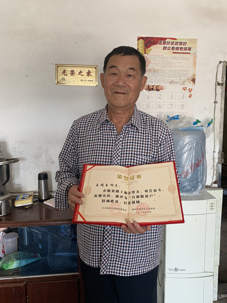 老王今年69岁,中共党员,是荆州市荆州区马山镇安碑村人,其结对帮扶干部是荆州市信访局朱堃。老王1969年在四川省当兵,1975年退役回到家乡。“6年军涯生活锻炼了我不怕吃苦、自立自强的品格”,每每回想起来,他说这是从军经历带给他最宝贵的东西。老王家中有5个人,因本人中风、妻子患糖尿病、母亲近百岁高龄、孙女上学致贫,2014年纳入建档立卡贫困户。人贫志不穷,退役不褪颜色,他杜绝了“等靠要”思想,在健康扶贫、教育扶贫、产业扶贫等政策支持下,经过自身持续勤劳奋斗,于2016年脱贫,现在生活过得日益红火。