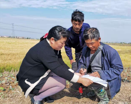 图为白湖村扶贫干部李宫霞(左)到鸭子放养现场办理王龙明(右)自主发展产业奖补金相关手续