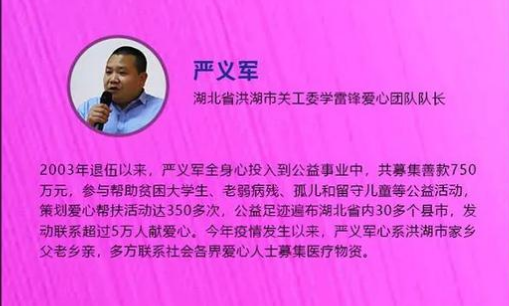 严义军系湖北省洪湖市人,中共党员。2003年从部队退伍,便全身心投身公益事业。爱心洒遍洪湖市各个乡镇街道及湖北省内其它30多个县市。18年来,他一直践行雷锋精神助人为乐。他将自己所有的近50万元积蓄投入其中,他联系和发动数万人省内外数以万计的党员干部及社会各界爱心人士,参与爱心公益事业,他组织爱心捐赠活动350多次,帮扶困难群众数千人,帮扶受益的农村留守儿童达几万名,积极响应了党建和国家“打赢脱贫攻坚战”的号召。
