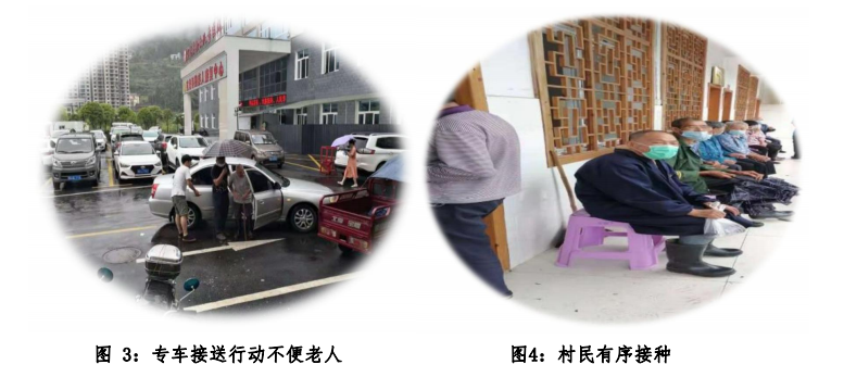 8月13日早7点,中雨如期而至,疫苗接种“清零” 行动按期展开。支部书记田孟平与第一书记范重庆分赴两个接 种点进行总协调,副书记李仕鹏、向文与村委委员袁胜祥、党 员志愿者张成芳驾车入户,镇卫生院6位医生分两个点接种,大学生志愿者负责现场引导……井井有条!