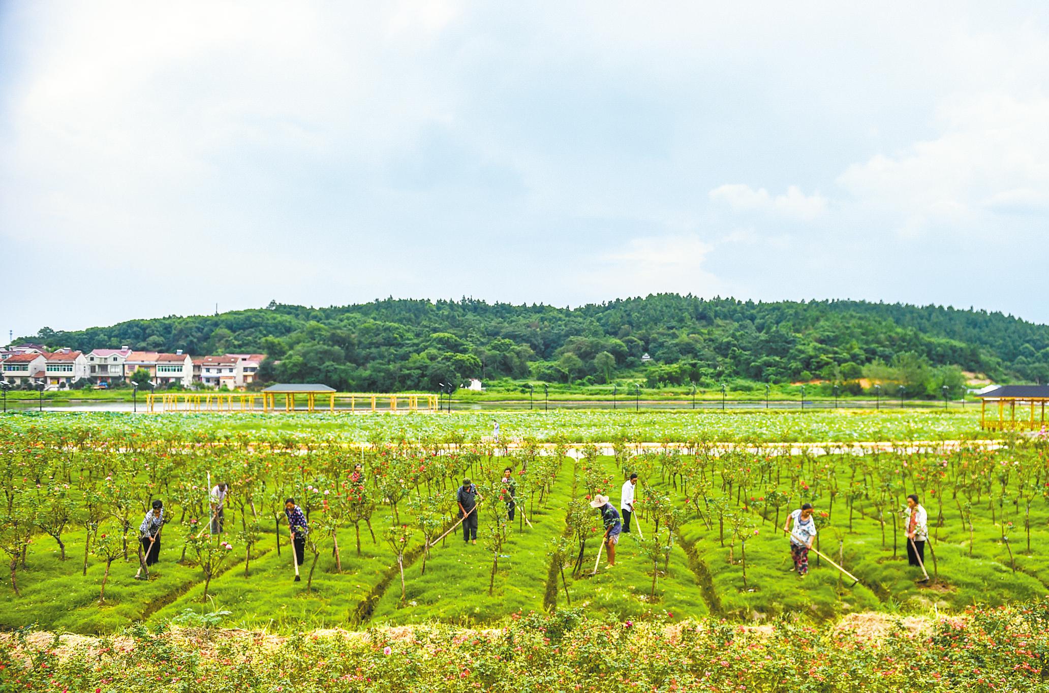 武穴市田家镇引进人才将荒地打造成田园综合体。图为村民在月季花田里劳作。(湖北日报全媒记者 薛婷 何宇欣 通讯员 李志华 摄)