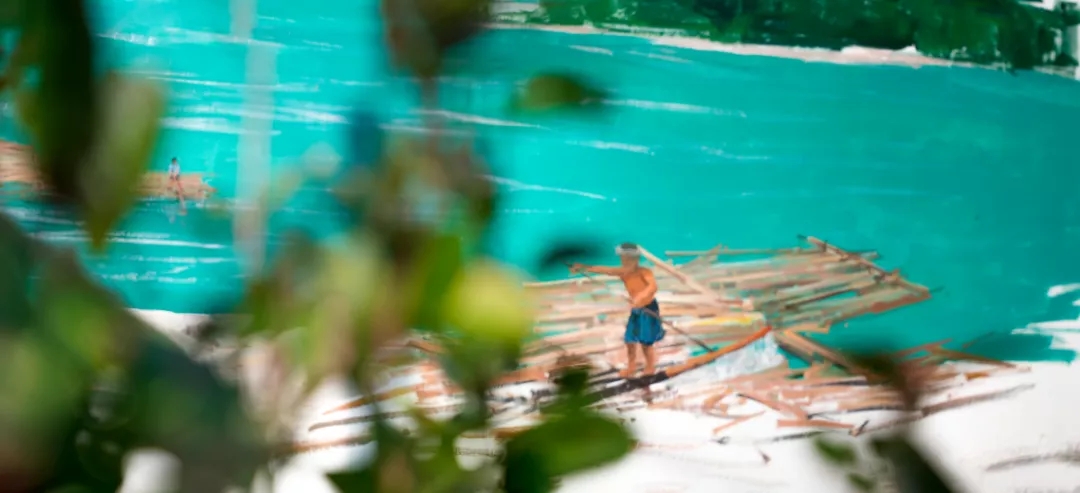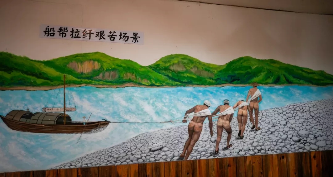 这幅画再现了清江放排的场景当年四川船客经过高坝洲有很多木材要运送出去把木材用绳子拴在一起沿江顺流漂下历史的瞬间,定格在墙上
