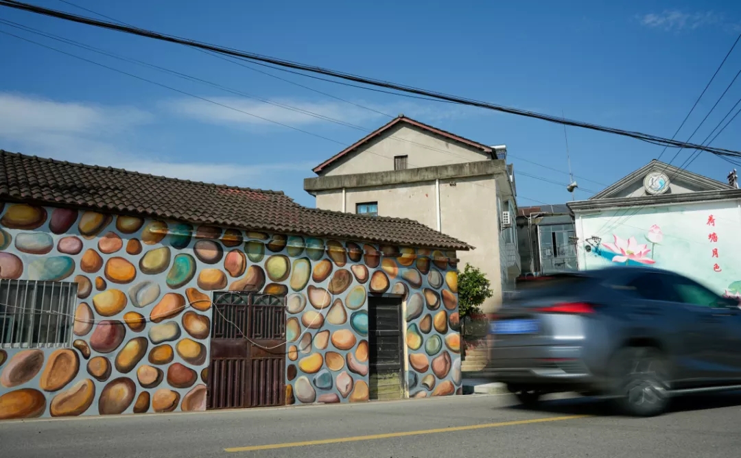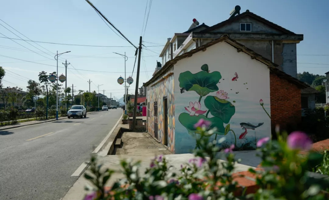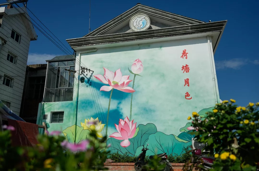 行经一处鱼塘对面的民居墙上出现一片“荷塘月色”田田的叶子叶子出水很高像亭亭的舞女的裙仿佛送来缕缕清香▼