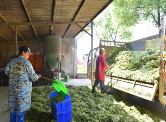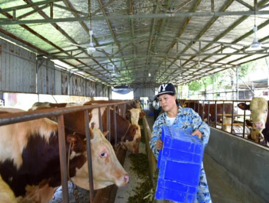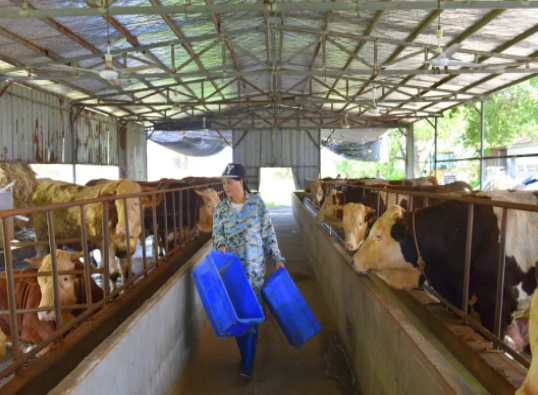 6月18日,在荆州区马山镇梅花湾村二组一家养殖场里,村民刘在梅正在自家牛舍忙着清扫食槽、投喂草料。今年50岁的刘在梅原本是村里建档立卡贫困户,早年丈夫因意外去世,上有老下有小的她只能外出山东打工养家糊口。但是身处异地又无一技之长,2016年她选择回家,向亲朋好友借了30多万元,在村里和扶贫工作组的帮助下开始尝试养牛。从最开始的分期分批小规模养殖到如今近百头的养殖规模,刘在梅不仅顺利脱贫,日子也越过越红火。