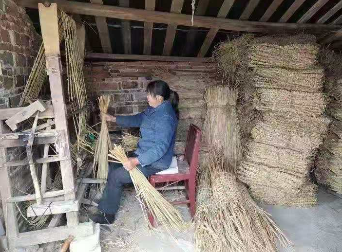 一次走访中,工作队看望贫困户李爱荣时,了解到上世纪70年代,村里曾盛行稻草打草包的习俗,很多村民都会草袋编织技术,由于交通不便,销售市场一片空白,导致这项技术被搁置多年,村民还是依靠传统的种养殖,或者务工模式提高收入。 靠山吃山,靠水吃水,扶贫工作小组灵机一动,既然村里盛产稻谷稻草,何不就地取材,盘活资源优势呢?他们做好入户走访,引导群众参与,算好经济账等一系列筹备工作,还邀请了致富能手、草袋编织“专家”过来教学,推广以“机器编织+手工制作”多位一体,齐头并进的生产经营发展模式,鼓励村民重振旗鼓,重操“旧业”。