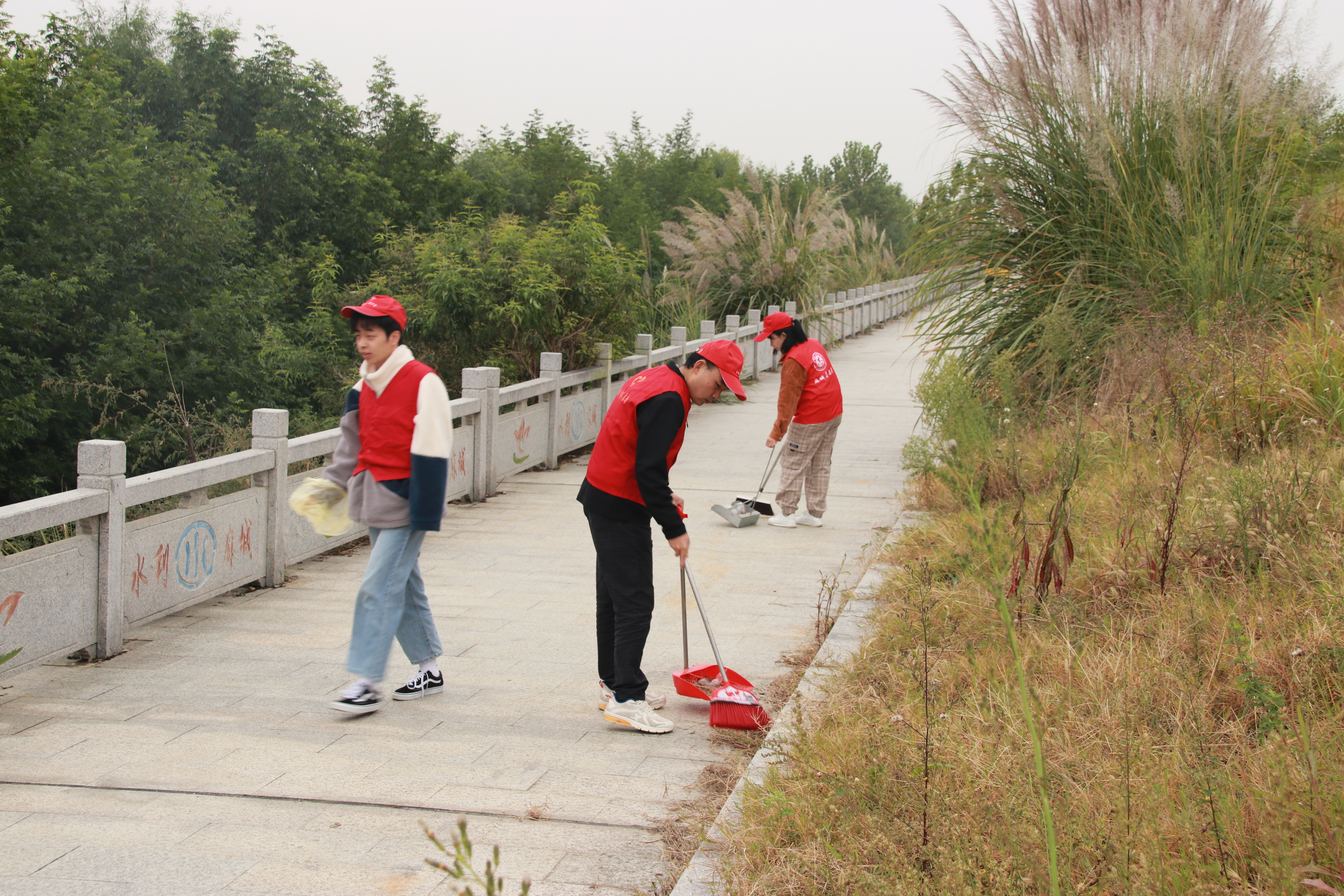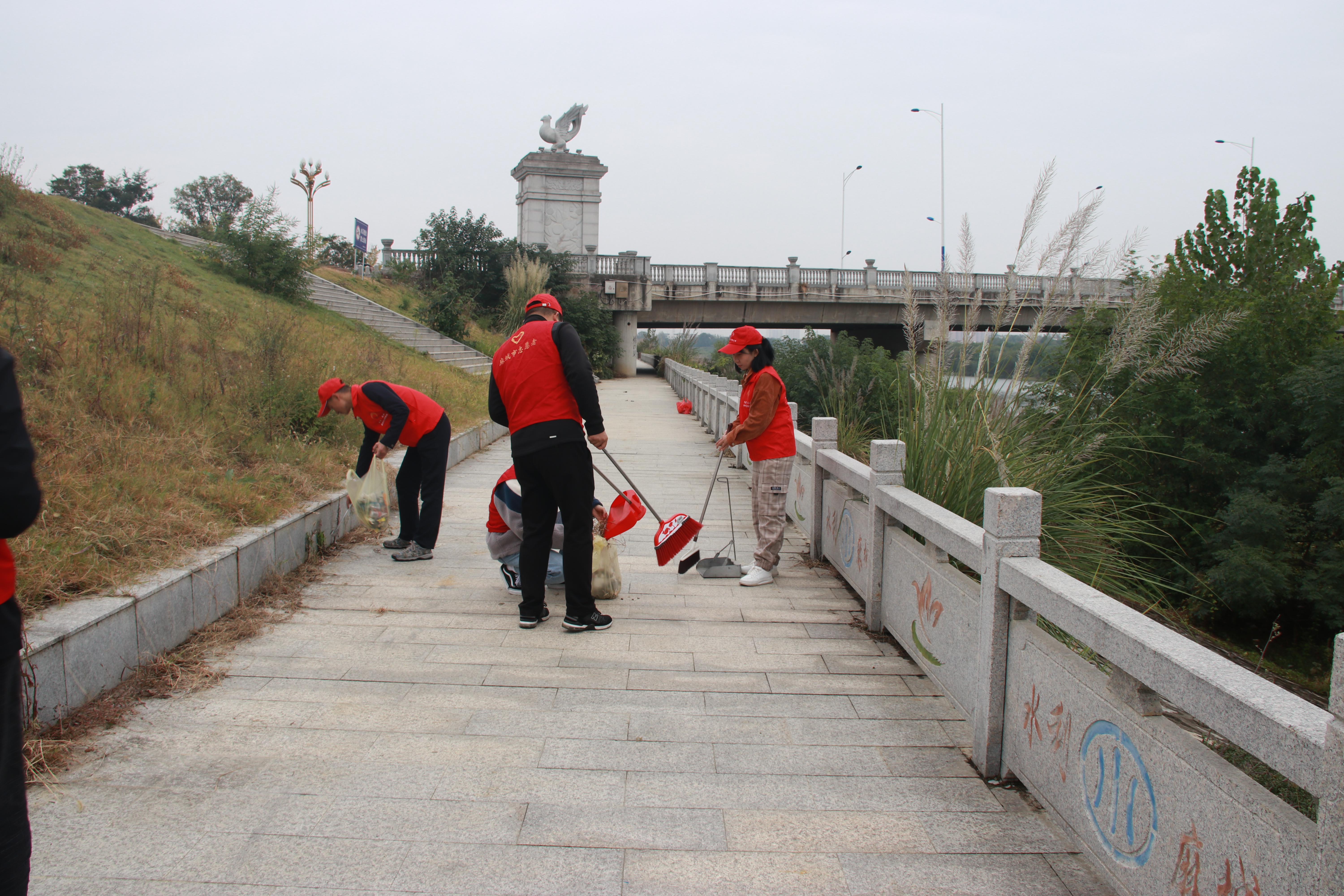 “喜哥,快把你手里的钳子给我用一下,这儿有个纸巾被人丢到绿化带里了,我的扫帚弄不出来……”活动开始后,只见志愿者们一个个热情高涨,干得不亦乐乎。有的左手拿着钳子,右手提着垃圾袋,沿着河堤捡拾被人丢弃在绿化带及河边的烟蒂、纸巾、零食袋和矿泉水瓶等废弃物,有的拿着扫帚和撮箕,全神贯注地清扫着垃圾……经过志愿者们的仔细搜寻捡拾,不一会儿的工夫,河堤及绿化带上变得干干净净,河边美景让人觉得更加赏心悦目。