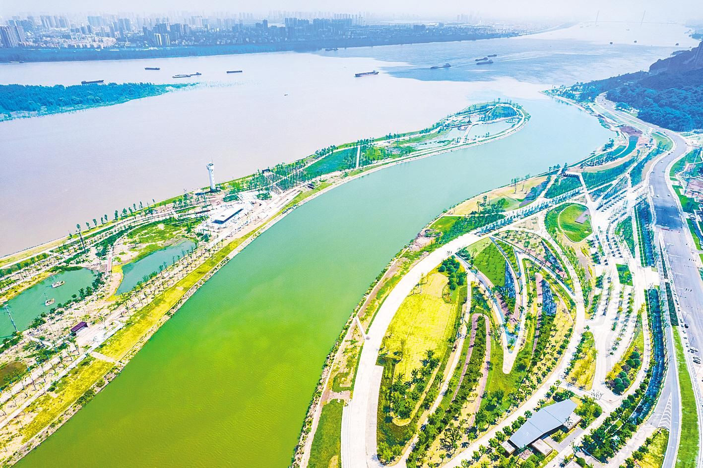 航拍鄂州樊口江滩综合整治工程,这是目前湖北省长江大保护投资最大的单体项目。(湖北日报全媒记者 薛婷 摄)