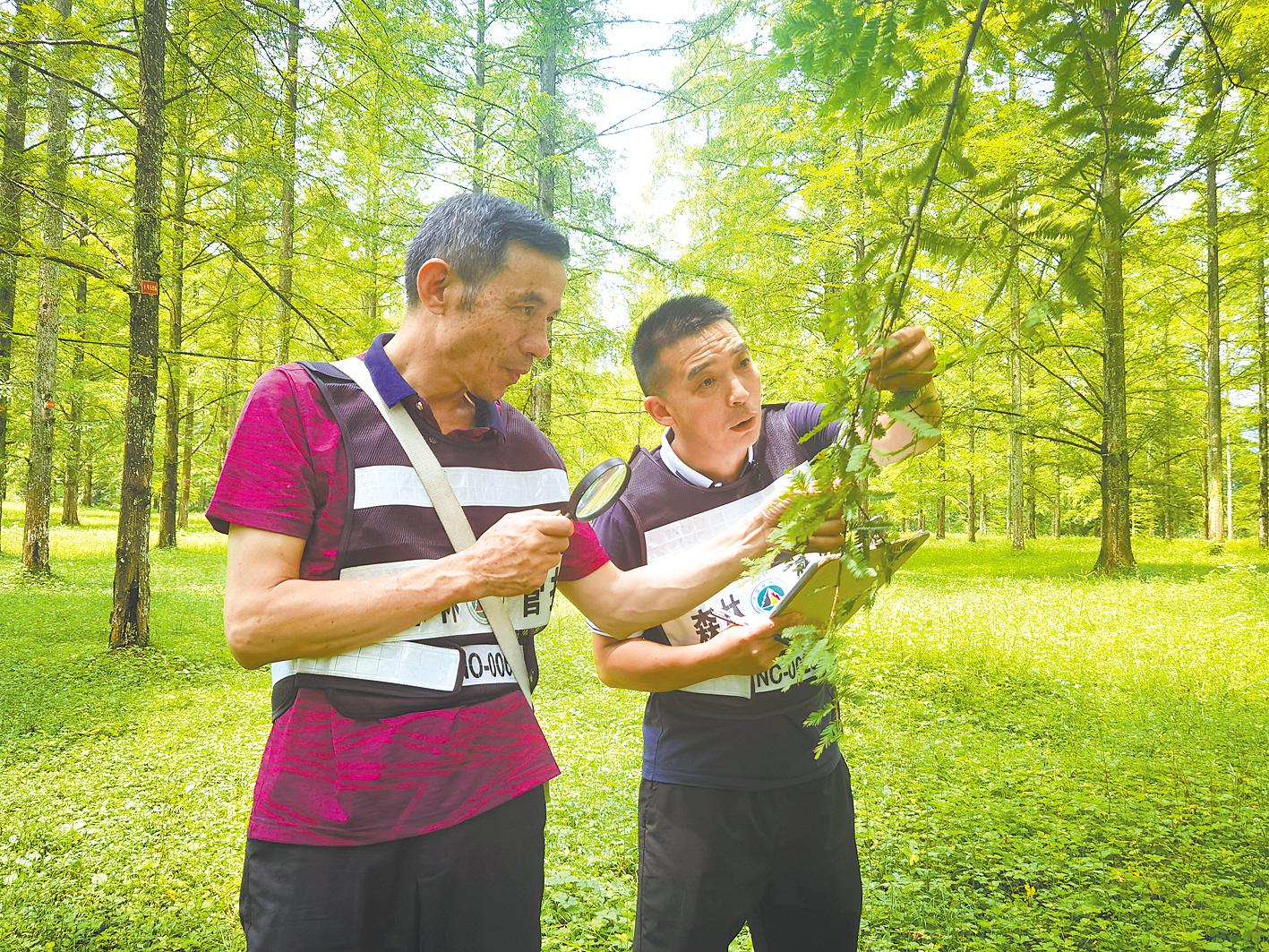 利川市林业局工作人员在忠路镇小河水杉林检查树木病虫害。(视界网 张宝训 摄)