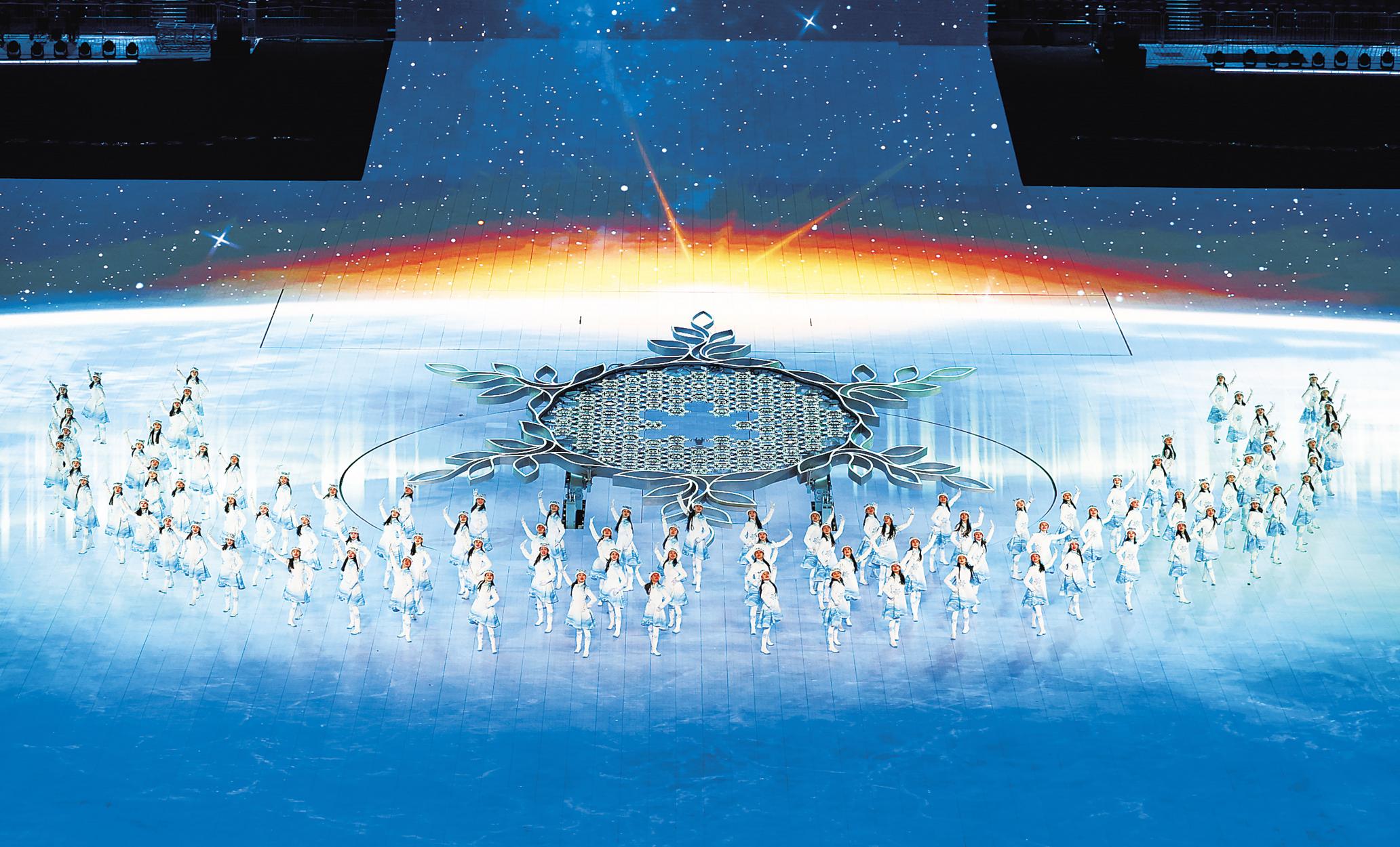 2月4日晚的开幕式上,在约翰·列侬《想象》的歌声里,24名身着红色运动服的运动员,以矫健身姿滑过冰面,留下长长轨迹。“更快、更高、更强——更团结”的奥林匹克格言,跃然其上。