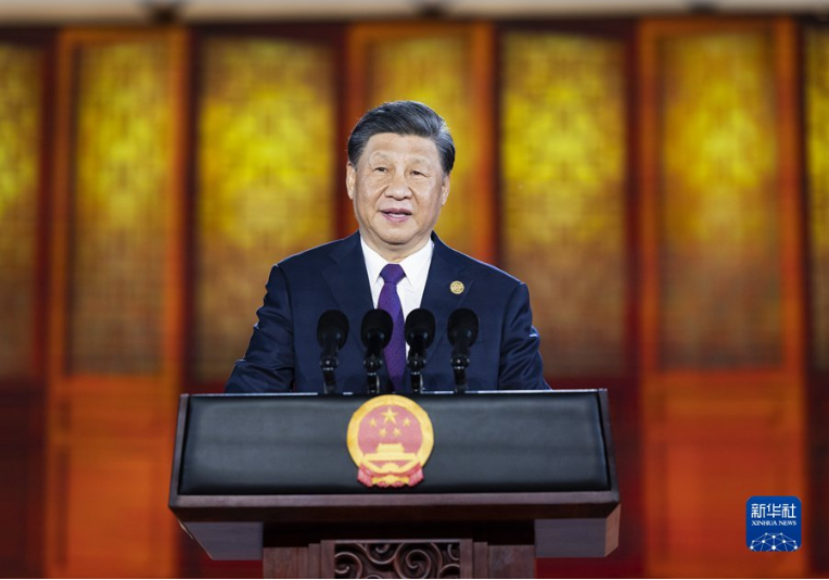 5月18日晚,国家主席习近平和夫人彭丽媛在陕西省西安市大唐芙蓉园为出席中国-中亚峰会的中亚国家元首夫妇举行欢迎仪式和欢迎宴会。宴会后,习近平夫妇同贵宾们共同观看中国同中亚国家人民文化艺术年暨中国-中亚青年艺术节开幕式演出。这是习近平发表欢迎致辞,代表中国政府和中国人民热烈欢迎中亚各国元首。新华社记者 黄敬文 摄