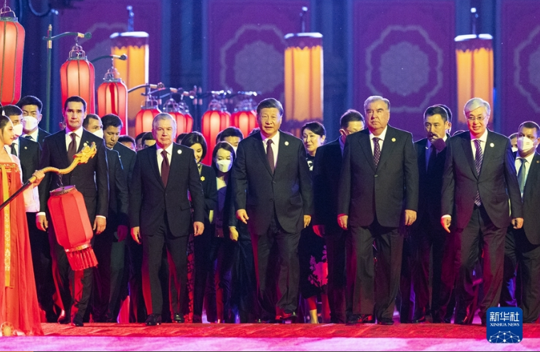 5月18日晚,国家主席习近平和夫人彭丽媛在陕西省西安市大唐芙蓉园为出席中国-中亚峰会的中亚国家元首夫妇举行欢迎仪式和欢迎宴会。宴会后,习近平夫妇同贵宾们共同观看中国同中亚国家人民文化艺术年暨中国-中亚青年艺术节开幕式演出。这是习近平和彭丽媛同贵宾们共同前往元功门举行欢迎宴会。新华社记者 黄敬文 摄