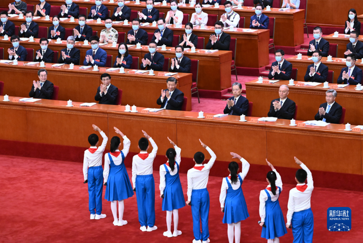6月19日,中国共产主义青年团第十九次全国代表大会在北京人民大会堂开幕。习近平、赵乐际、王沪宁、蔡奇、丁薛祥、李希等在主席台就座,祝贺大会召开。这是少先队员向大会献词。新华社记者 燕雁 摄