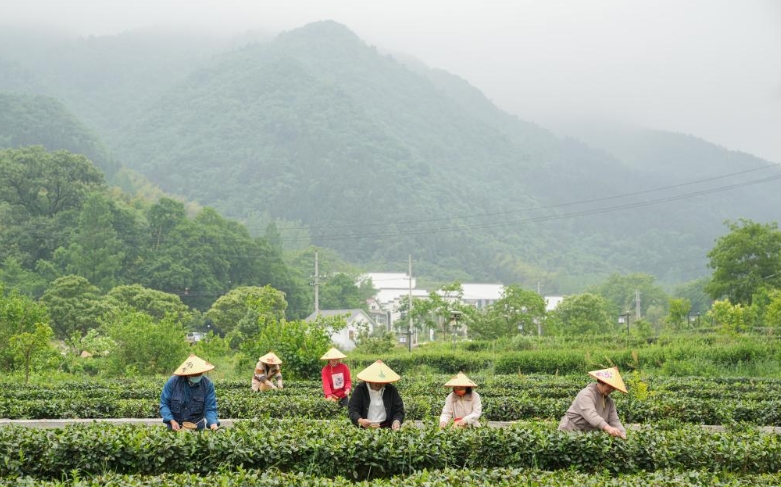 2022年5月11日,村民在大湾村生态茶园内采摘茶叶。新华社记者杜宇摄