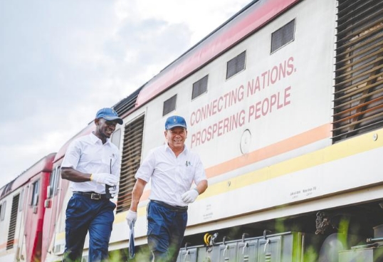 在肯尼亚内罗毕,非洲之星铁路运营公司机辆部的火车驾驶员蒋立平(右)与学员霍勒斯从一辆印有“连接国家 走向繁荣”标语的蒙内铁路机车旁走过(5月23日摄)。(新华社发)