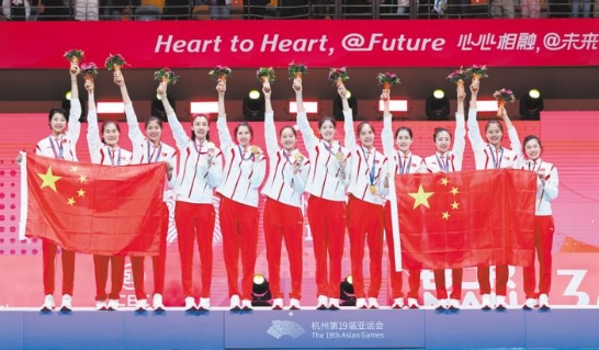 10月7日,杭州亚运会,中国女排再创佳绩,以六战全胜第九次摘得亚运金牌。(新华社发)