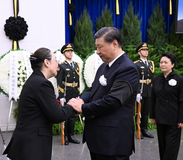 11月2日,李克强同志遗体在北京八宝山革命公墓火化。习近平、李强、赵乐际、王沪宁、蔡奇、丁薛祥、李希、韩正等前往八宝山送别,胡锦涛送花圈表示哀悼。这是习近平与李克强亲属握手,表示深切慰问。 新华社记者 谢环驰 摄