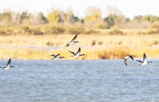 11月12日,在黄河三角洲国家级自然保护区,越冬候鸟在飞翔。(新华社发)