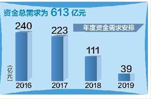 全省要完成建档立卡贫困人口易地扶贫搬迁,资金总需求为613亿元。年度资金需求安排:2016年安排240亿元;2017年安排223亿元;2018年安排111亿元;2019年安排39亿元。