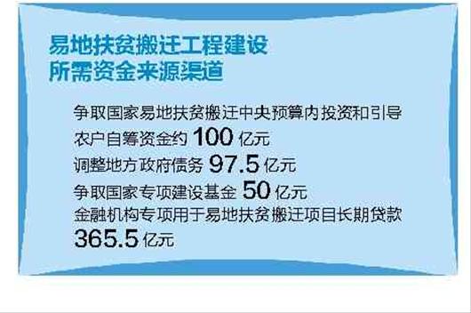易地扶贫搬迁工程建设所需资金来源渠道:争取国家易地扶贫搬迁中央预算内投资和引导农户自筹资金约100亿元,地方政府债务97.5亿元,争取国家专项建设基金50亿元,金融机构专项用于易地扶贫搬迁项目长期贷款365.5亿元。