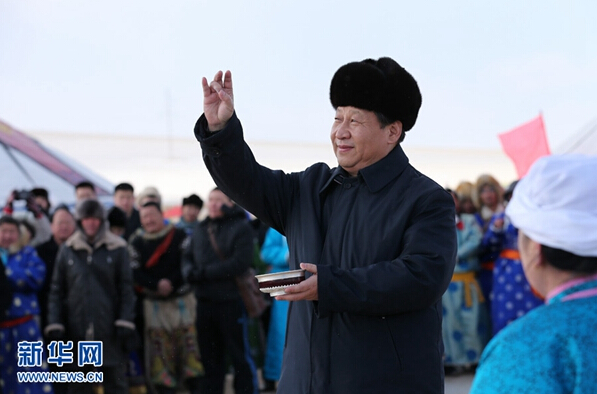 这是2014年1月27日,在锡林浩特市宝力根苏木(乡)冬季那达慕“五畜祈福”仪式上,习近平按照蒙古族习俗,用无名指蘸上银碗盛着的鲜牛奶弹了三下,祝福来年风调雨顺,五畜兴旺,人民幸福安康。新华社记者 庞兴雷 摄