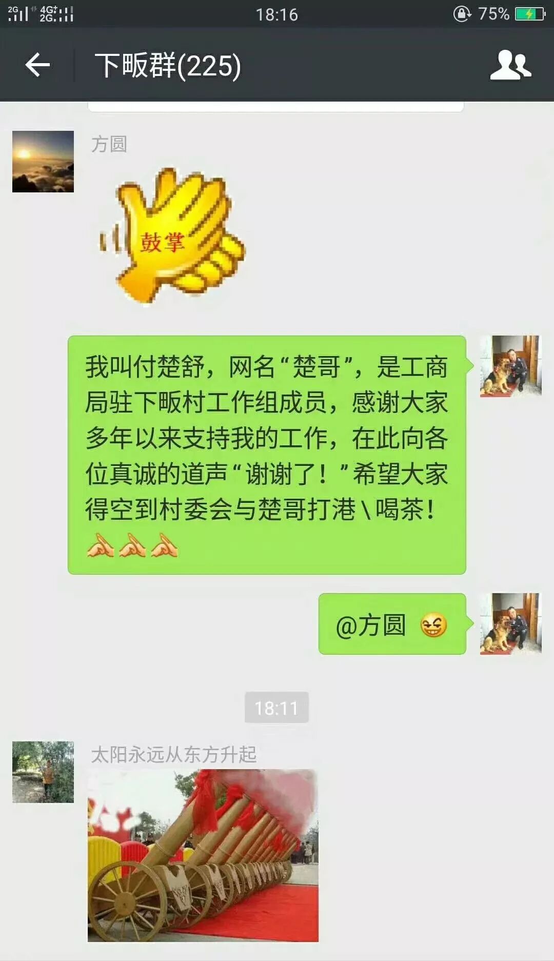工作方式方法很重要,寻准了突破口将会事半功倍:村里有对老:"剌头″,有事冇事隔三差五的找点事儿凑凑热闹,我主动添加该户第三代孙辈为微信好友,经过漫长的正能量灌输,政策方面的解答,为人处世方面的相互探讨,微友非常积极配合劝服家里老人,效果特别明显。现在老人也理解支持配合我们工作了,楚哥也特有成就感!
