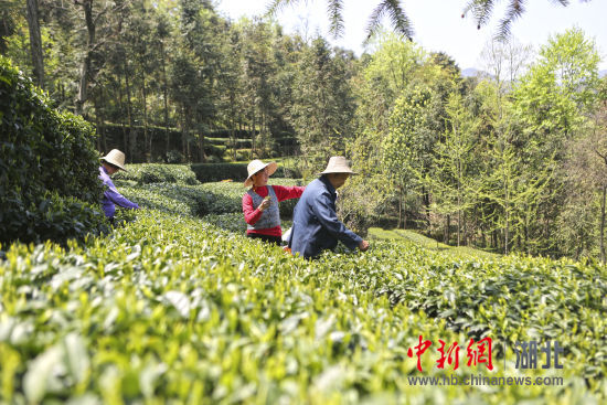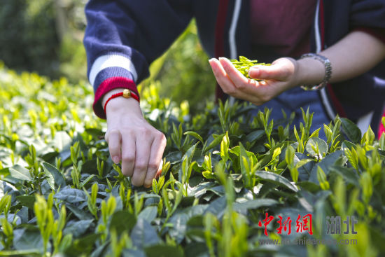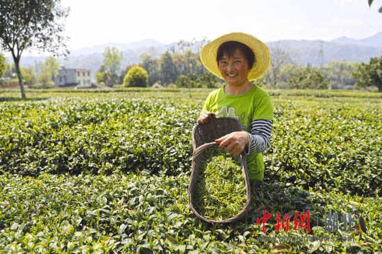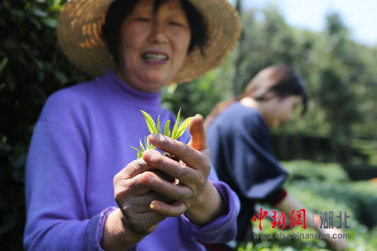 中新网湖北新闻4月14日电 (汪军)4月13日,钟明桃一家在自家茶园忙着采摘新茶,早晨的阳光撒向茶园,反映的绿光打在她红扑扑的脸上,显得格外健康美丽。她是土城乡茅家店村四组村民,两亩茶园里的一季春茶是全家的一笔重要收入。