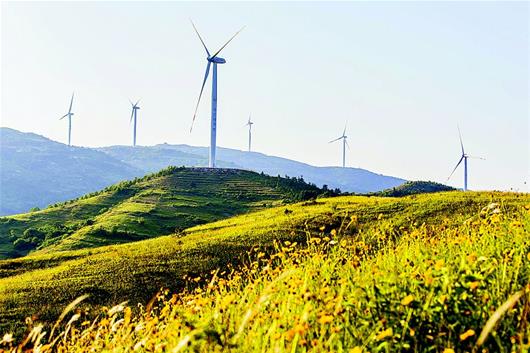 湖北日报讯 27日,在大悟双桥花山,远处山头上的风力发电场与成片的金鸡菊形成一道靓丽风景。该县大力发展风力发电和集中式光伏发电项目,全县风电装机容量达60万千瓦。