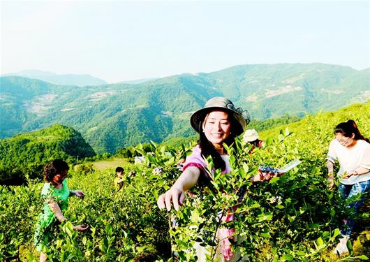 农村新报讯 眼下,保康县的5000亩有机蓝莓进入成熟期。黑珍珠般的蓝莓香飘四溢,武汉、襄阳、十堰、宜昌等地的游客纷至沓来,体验高山生态蓝莓采摘的乐趣。图为5月29日游客在该县官山有机蓝莓生产基地采摘蓝莓。(通讯员陈泉霖摄)