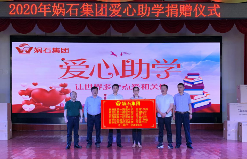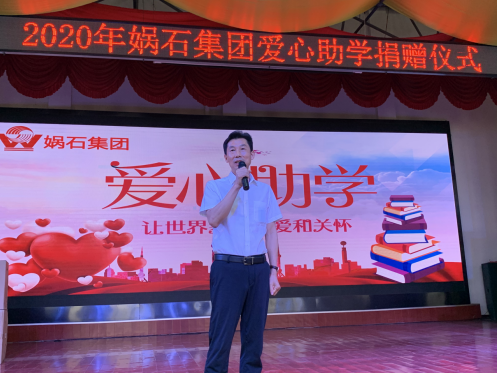 媧石集团董事长魏华山向受捐赠学校校长举牌捐赠
